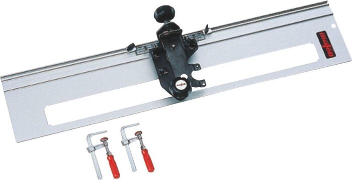 Пристрій для фрезерування пазів (тетиви драбини) напрямна лінійка (1 м) і дві струбцини код 200500. З цією оснасткою MAFELL пропонує столярам, що виготовляють сходи за індивідуальними проєктами, ідеальний допоміжний засіб. Робоча довжина — до 640 мм; робоча ширина — 60 мм точно встановлюється й жорстко фіксується. Пристрій застосовується для оброблення всіх без винятку зустрічних пазів під час виготовлення драбин. Ширина паза встановлюється за шкалою.