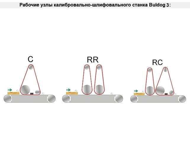- 2 типи робочих агрегатів: калібрувальний і шліфувальний. Контактний калибровальный вал тип R достатнього діаметру для великого знімання матеріалу за один прохід. Комбінований шліфувальний вузол – контактний гумовий вал з праскою – комбінація для видалення хвиль від шліфувальної стрічки. У деяких виробників калібрувалок такий тип шліфувального вузла може називатися RK, RT, T, K, KRT і т. д.