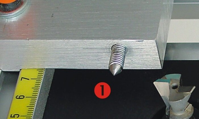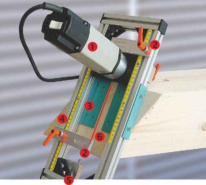 Деталі: 1.Фрезерний двигун. 2.Регулятор глибини фрезерування. 3.Позиціювальні пластини. 4.Лінійка. 5.Позиціювальний гвинт. 6.Позначка олівцем.