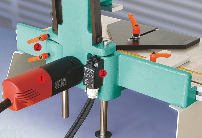 Компоненти верстата: 1.Фрезерний двигун. 2.Встановлення глибини фрезерування. 3.Електричний вимикач. |