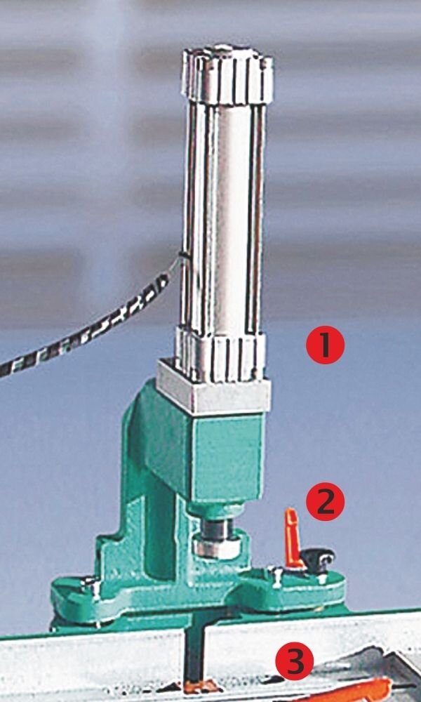 Компоненти верстата: 1.Фрезерний двигун. 2.Встановлення глибини фрезерування. 3.Електричний вимикач. |