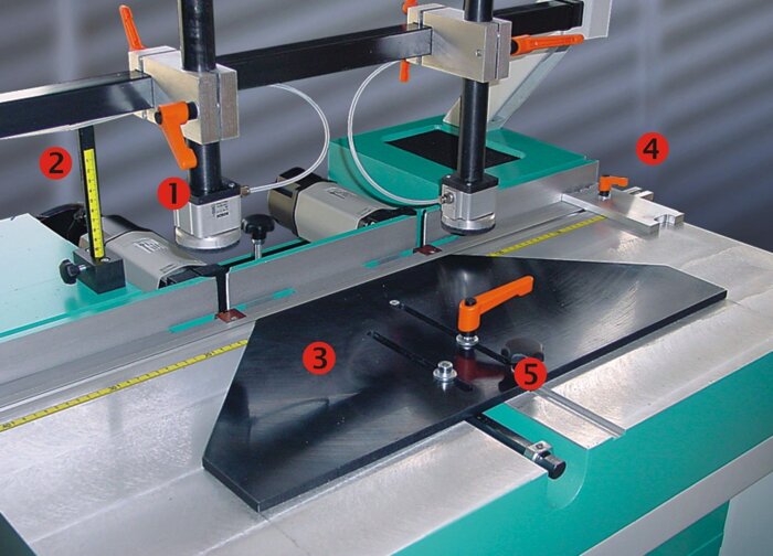 Рабочий стіл: 1.Зажим заготовки. 2.Установка глибини фрезерування. 3.Кутовий упор 45. 4.Торцевий упор. 5.Позиціювальний механізм. |