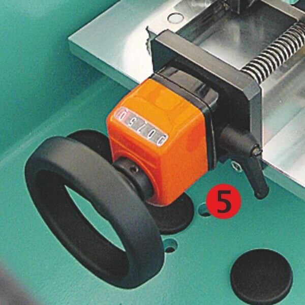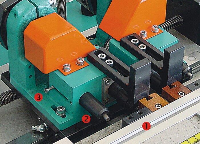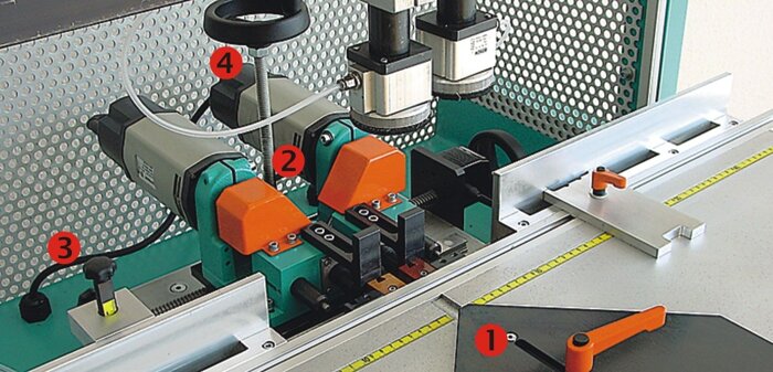 Робочий стіл: 1. Кутовий упор 45°. 2.Механізм приводу Hoffmann. 3.Встановлення глибини фрезерування. 4. Установка висоти (заміна інструменту). |
